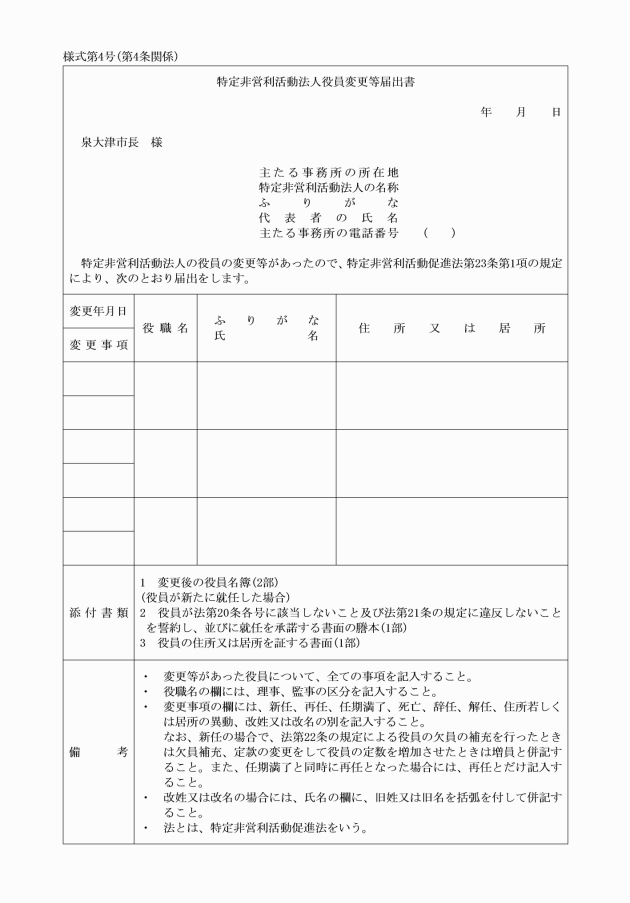 第4条 法第23条第1項の規定による届出は、特定非営利活動法人役員変更等届出書(様式第4号)を提出することにより行わなければならない。