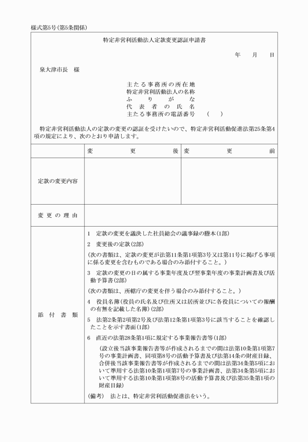 第5条 法第25条第4項の申請書は、特定非営利活動法人定款変更認証申請書(様式第5号)とする。