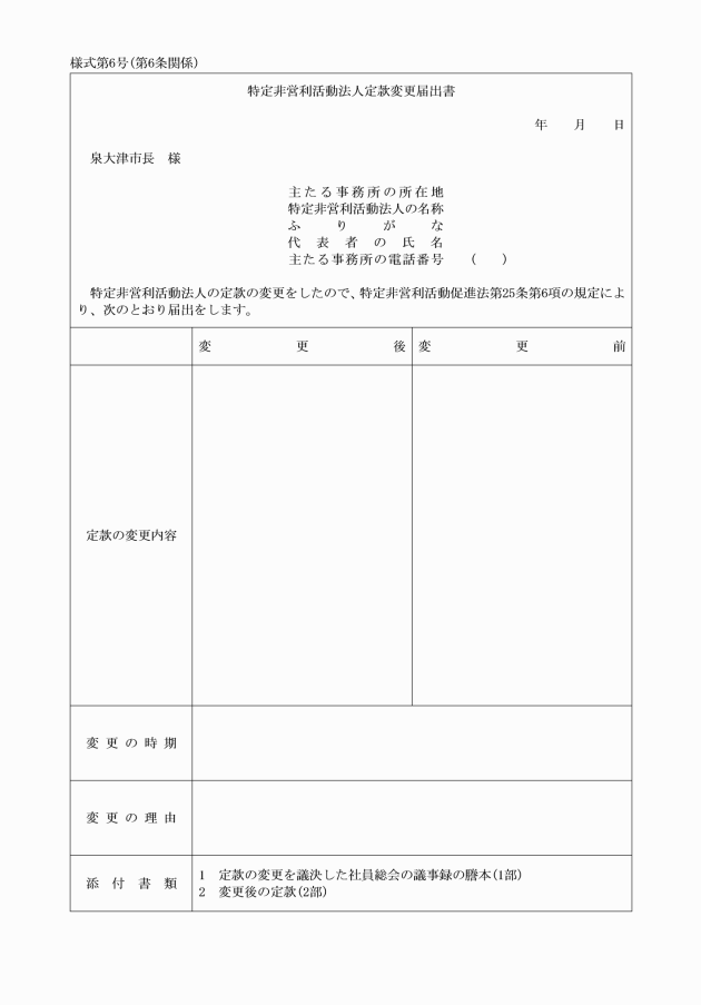 第6条 条例第4条第2項の届出書は、特定非営利活動法人定款変更届出書(様式第6号)とする。