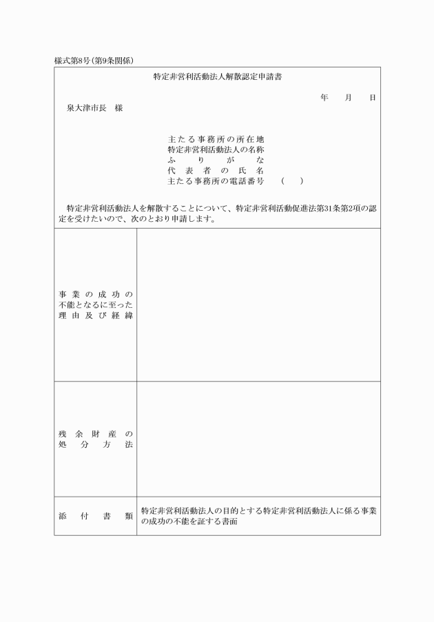 第9条 法第31条第2項の認定を受けようとする特定非営利活動法人は、同条第3項の書面を添付した特定非営利活動法人解散認定申請書(様式第8号)を市長に提出しなければならない。