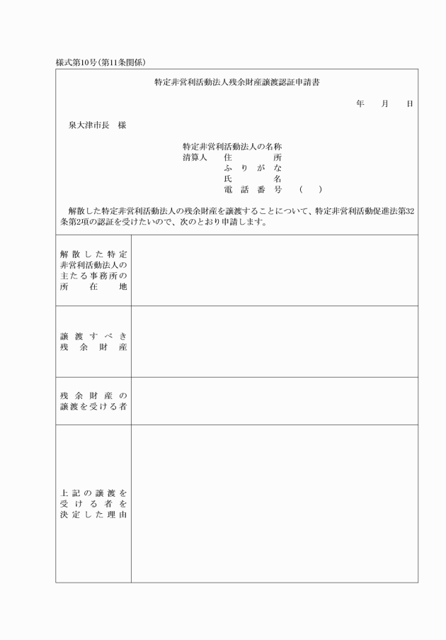 第11条 法第32条第2項の認証を得ようとする清算人は、特定非営利活動法人残余財産譲渡認証申請書(様式第10号)を市長に提出しなければならない。