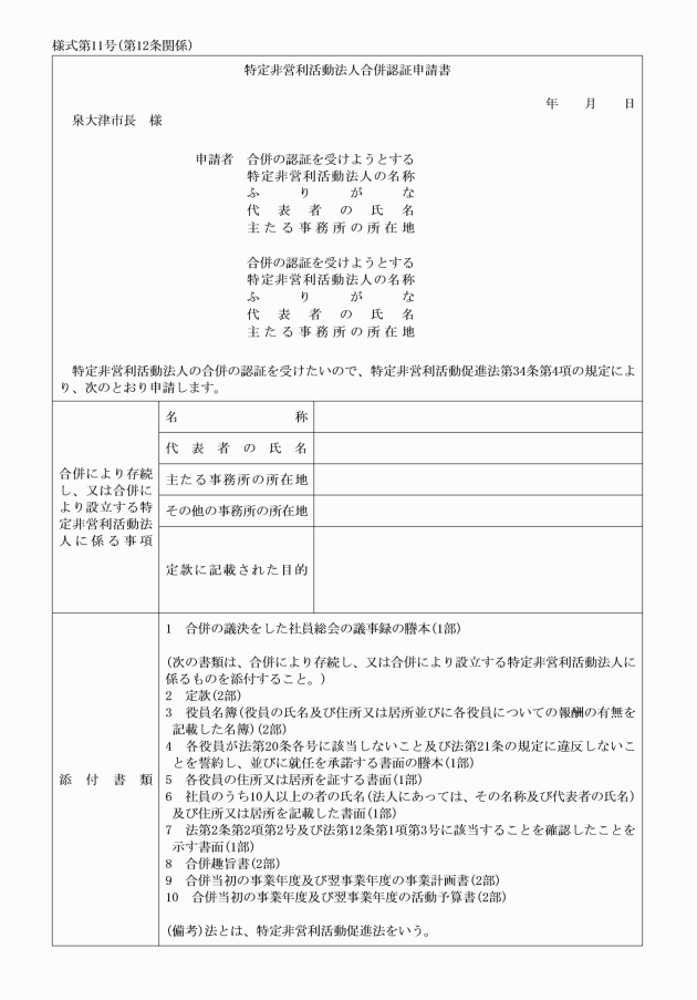 第12条 法第34条第4項の申請書は、特定非営利活動法人合併認証申請書(様式第11号)とする。
