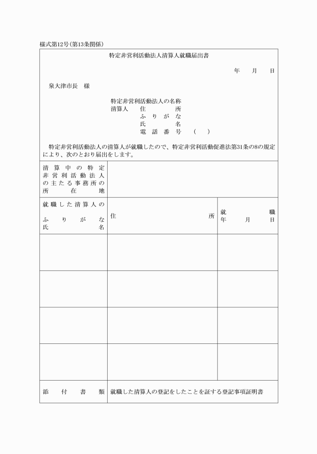 第13条 法第31条の8の規定による届出は、当該届出に係る清算人の登記をしたことを証する登記事項証明書を添付した特定非営利活動法人清算人就職届出書(様式第12号)を提出することにより行わなければならない。