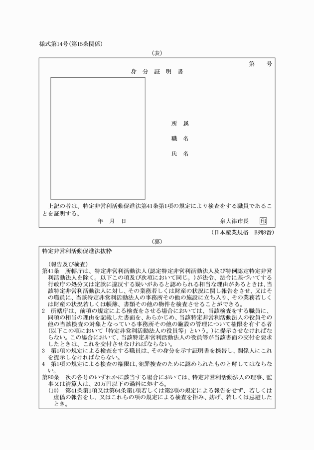 第15条 法第41条第3項の証明書は、身分証明書(様式第14号)とする。