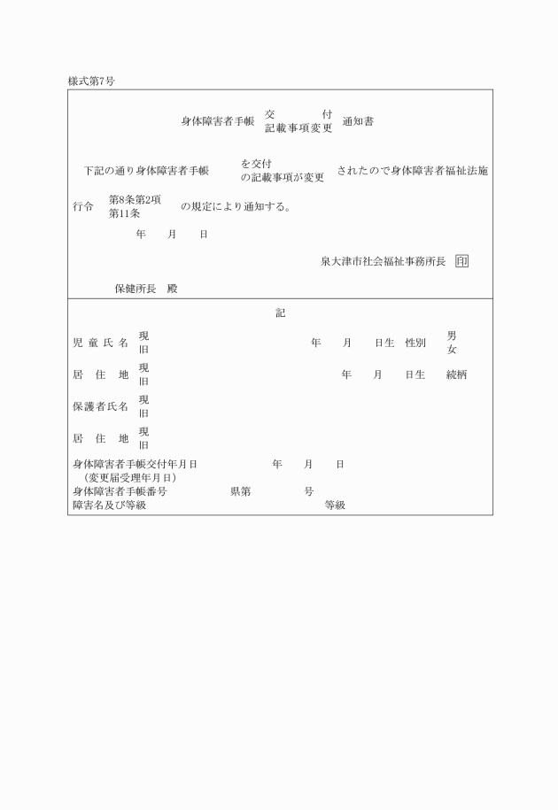 第6条 政令第8条第2項及び第11条の規定による保健所長への通知は、身体障害者手帳交付・記載事項変更通知書(様式第7号)によるものとする。