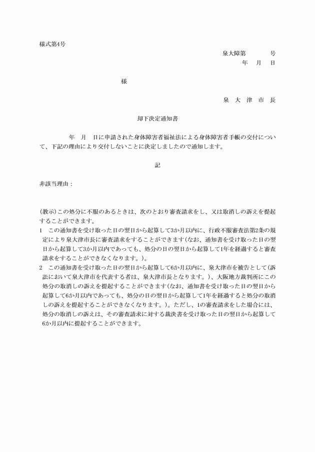 第4条 法第15条第5項の規定による通知は、却下決定通知書(様式第4号)によるものとする。