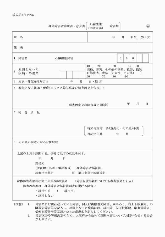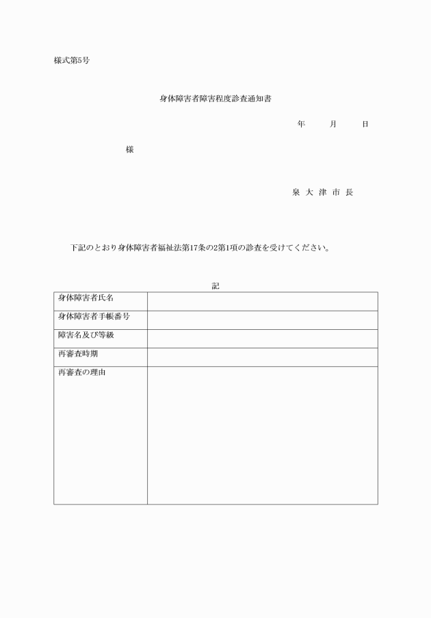 第5条 政令第6条第1項の規定による通知は、身体障害者障害程度診査通知書(様式第5号)によるものとする。