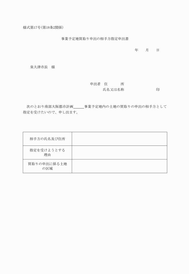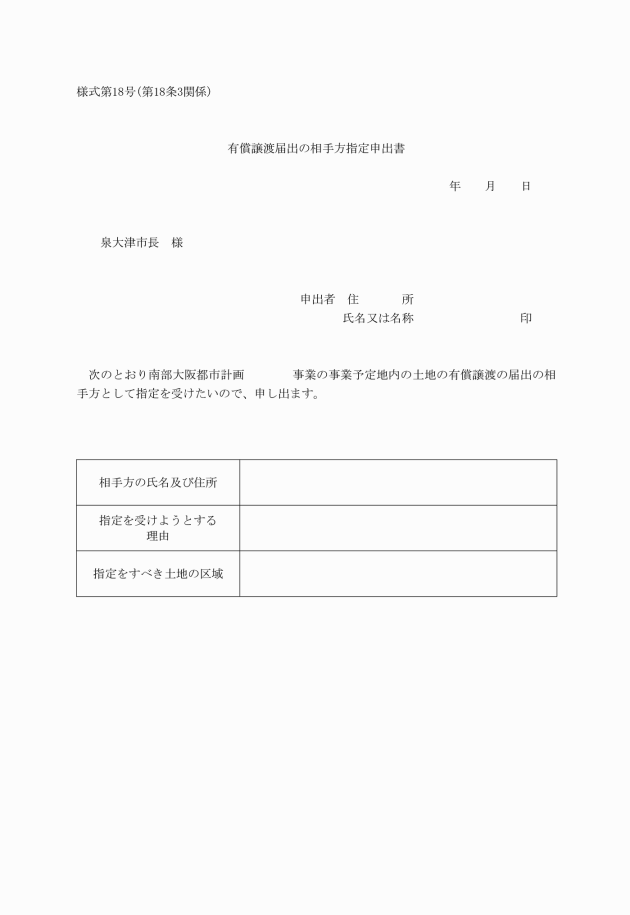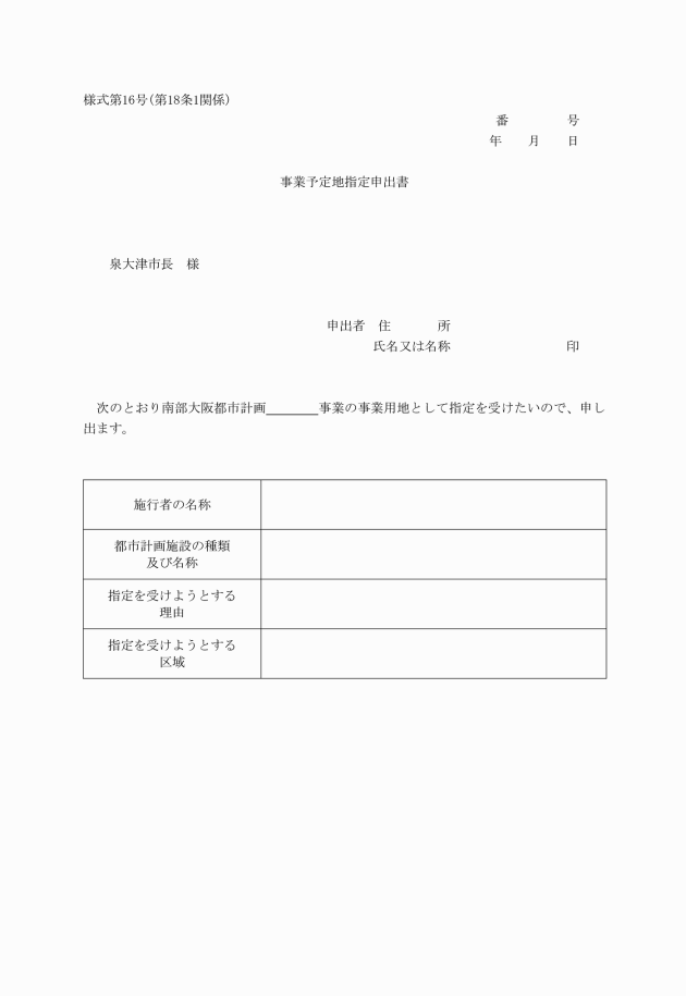 第18条 法第55条第2項の規定により事業予定地を指定すべきことを申し出ようとする者は、事業予定地指定申出書(様式第16号)に、次に掲げる図書を添えて市長に提出しなければならない。