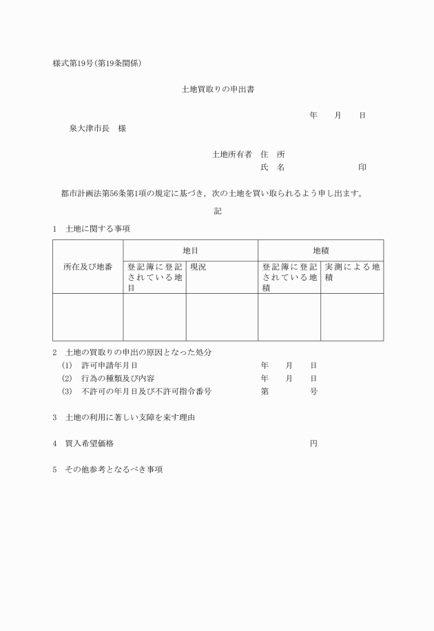 第19条 法第56条第1項の規定により土地の買取りを申し出ようとする者は、土地買取りの申出書(様式第19号)を市長に提出しなければならない。