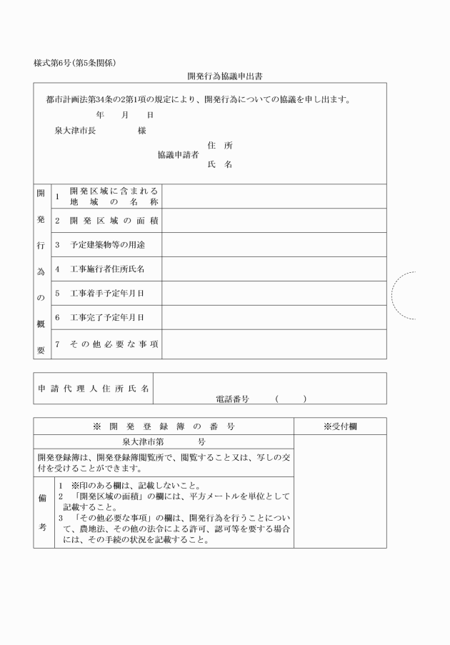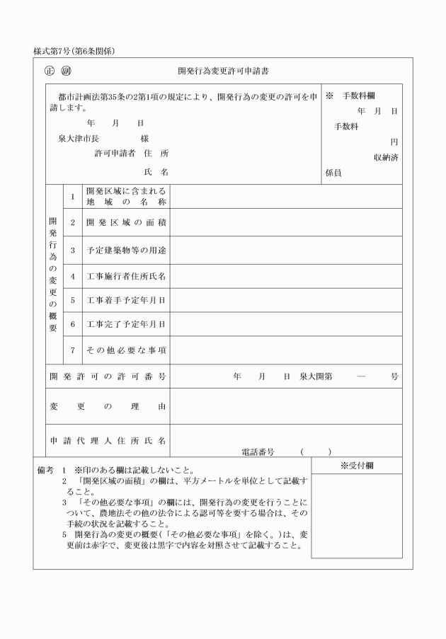 第6条 法第35条の2第1項の許可の申請は、開発行為変更許可申請書(様式第7号)を提出することにより行わなければならない。