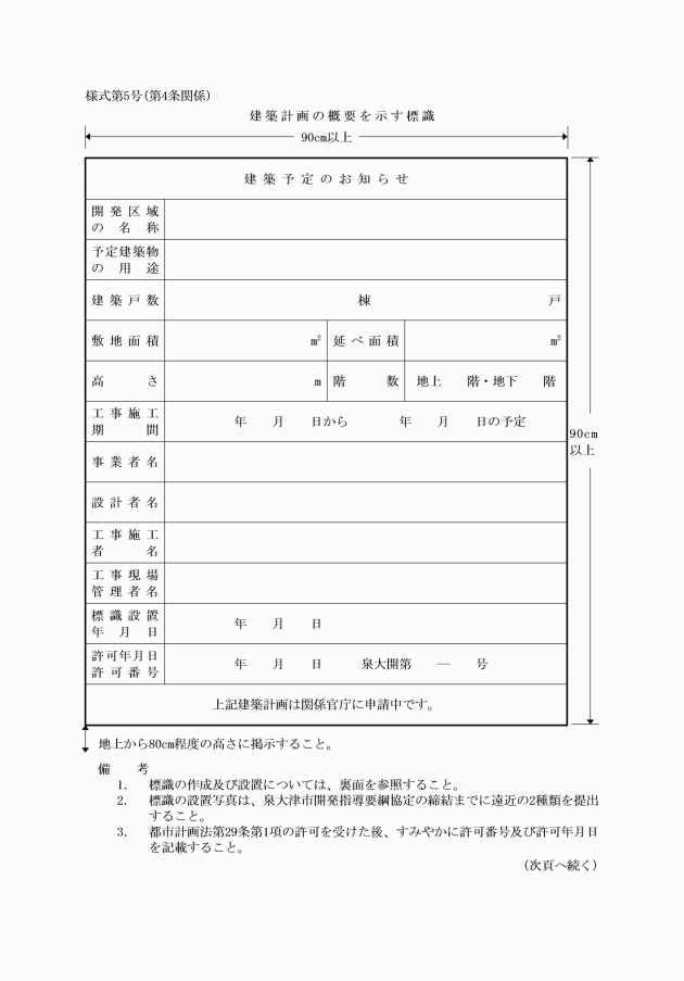 第4条 法第29条第1項の許可を受けた者は、当該許可に係る開発区域内の見やすい場所に、開発許可標識(様式第5号)を掲示しなければならない。