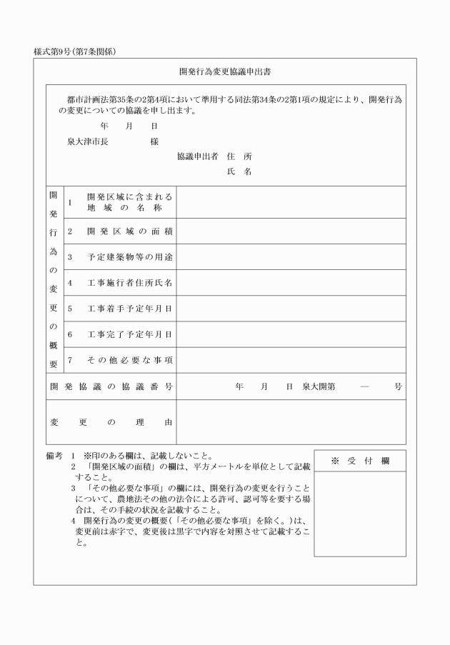 第7条 国の機関又は都道府県等は、法第35条の2第4項において準用する法第34条の2第1項の協議をしようとするときは、開発行為変更協議申出書(様式第9号)を市長に提出しなければならない。