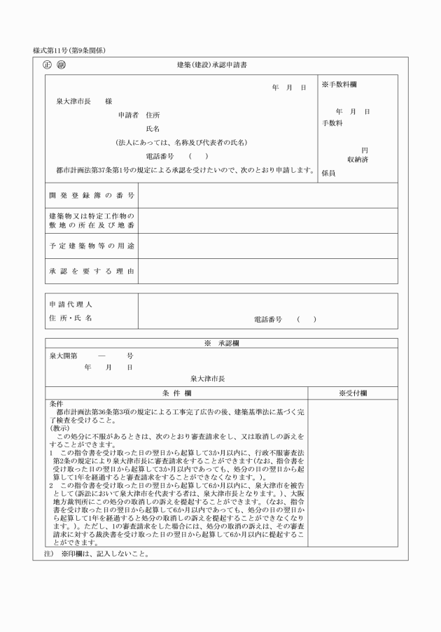 第9条 法第37条第1号の規定による承認の申請は、建築(建設)承認申請書(様式第11号)を提出することにより行わなければならない。