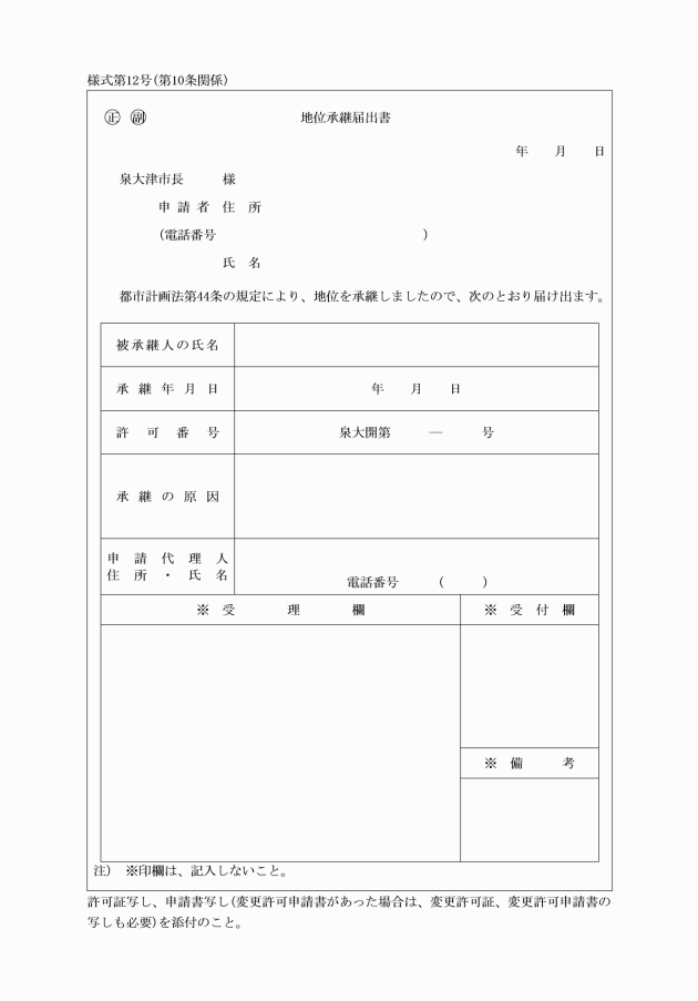 第10条 法第44条の規定により、被承継人が有していた開発許可に基づく地位を承継した者は、速やかに、地位承継届出書(様式第12号)を承継の原因たる事実を証する書類を添付して、提出しなければならない。