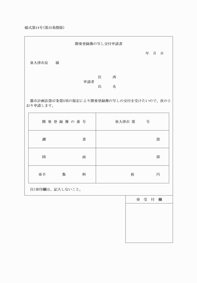 第15条 登録簿の写しの交付を受けようとする者は、開発登録簿の写し交付申請書(様式第14号)を市長に提出しなければならない。