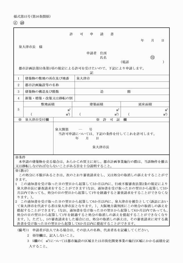 第16条 法第53条第1項の規定に基づく許可を受けようとする者は、許可申請書(様式第15号)を市長に提出しなければならない。