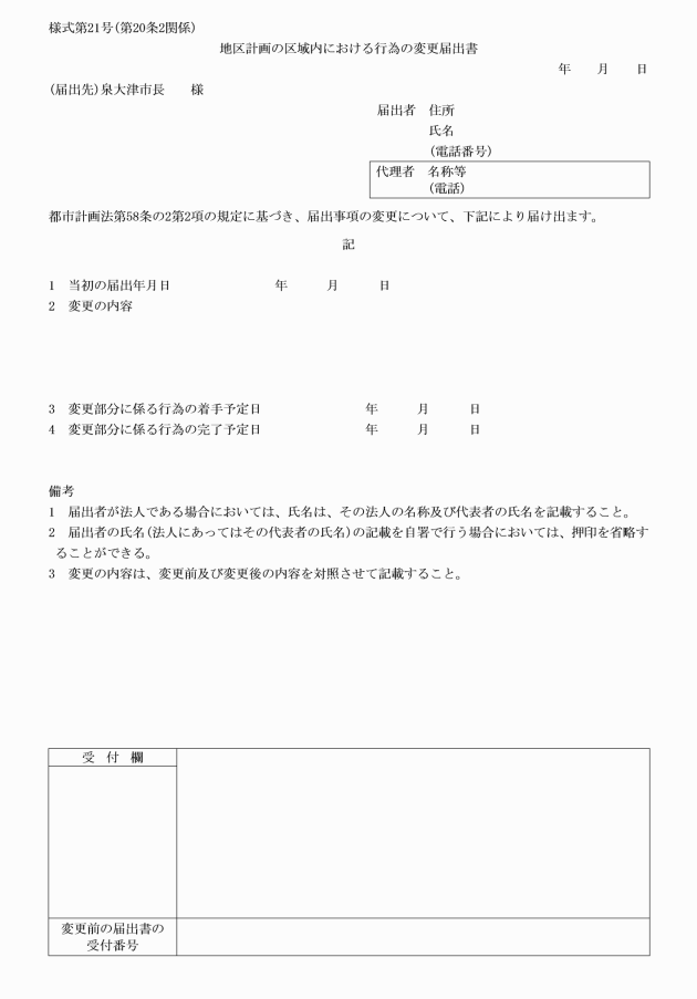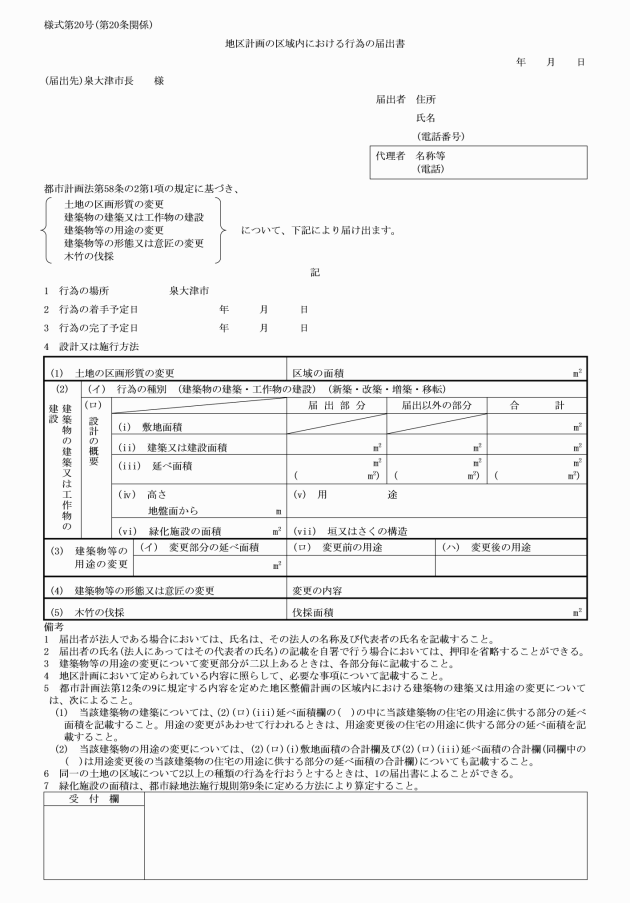 第20条 法第58条の2第1項の規定による届出は、届出書(様式第20号)を市長に提出することにより行うものとする。
