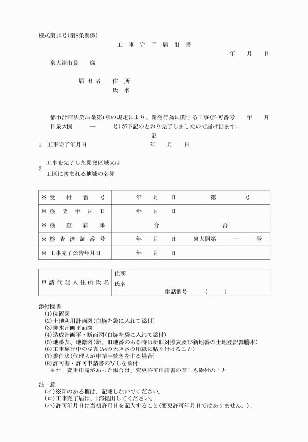 第8条 法第36条第1項の規定による届出は、工事完了届出書(様式第10号)を市長に提出しなければならない。