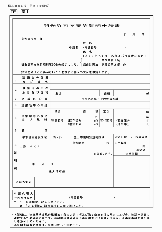 第24条 省令第60条の書面の交付の申請は、開発許可不要等証明申請書(様式第26号)を提出することにより行わなければならない。