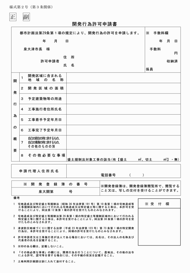 第3条 法第29条第1項の規定に基づく許可を受けようとする者は、開発行為許可申請書(様式第2号)を市長に提出しなければならない。