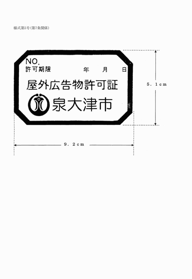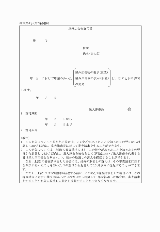 第7条 府条例第3条第1項、第8条の2第1項、第12条及び第15条の規定による許可は、屋外広告物許可書(様式第4号)を交付することにより行う。