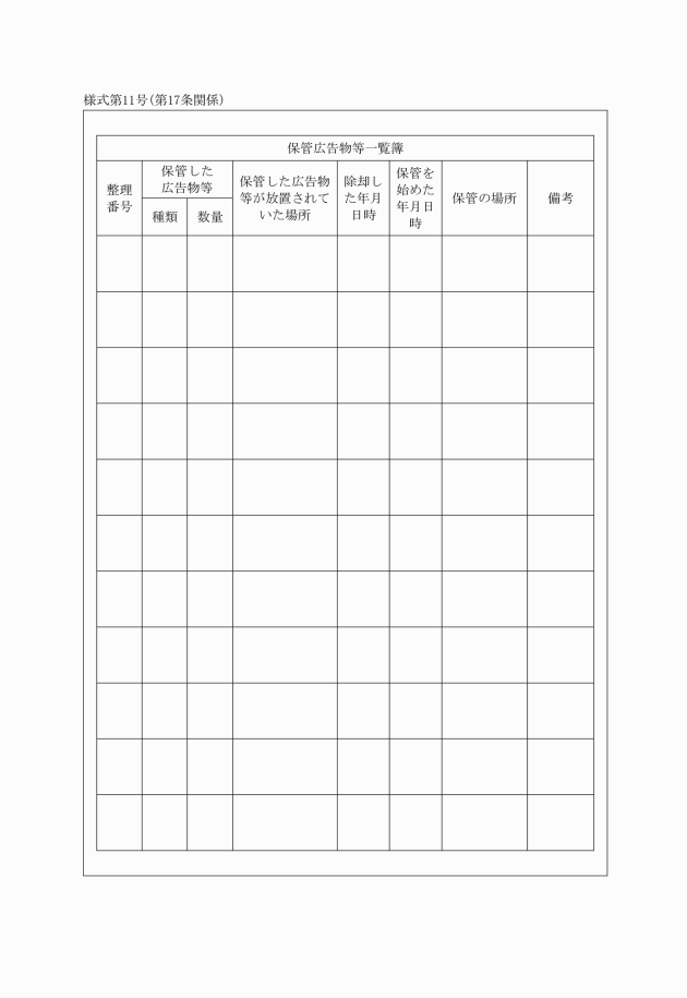 第17条 府条例第20条の3第1項第1号及び第2項の府規則で定める場所は、保管した広告物又は掲出物件の放置されていた場所を所管する市長が適当と認める場所とする。