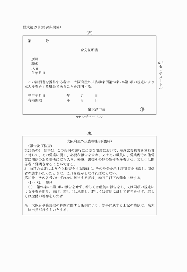 第20条 府条例第24条の6第2項の証明書は、身分証明書(様式第13号)とする。