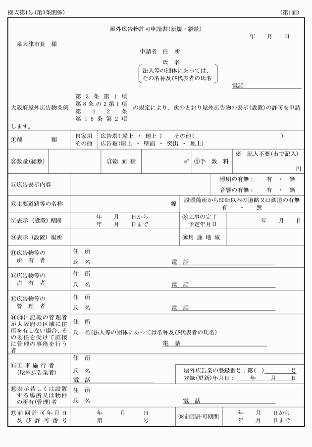 第3条 府条例第11条第1項の申請書は、屋外広告物許可申請書(様式第1号)とする。