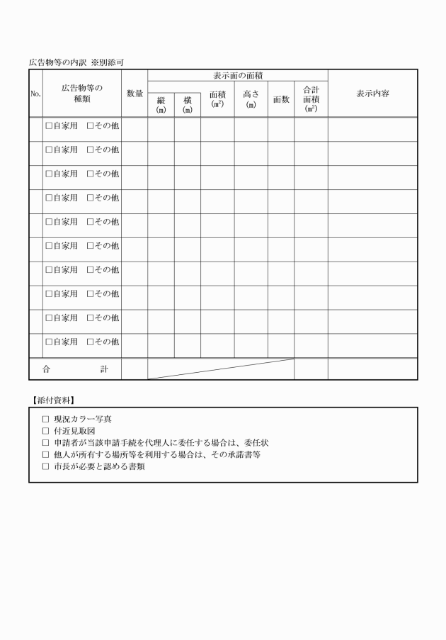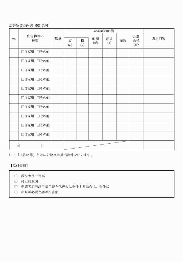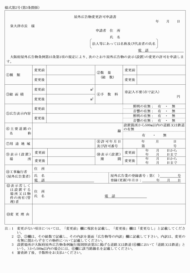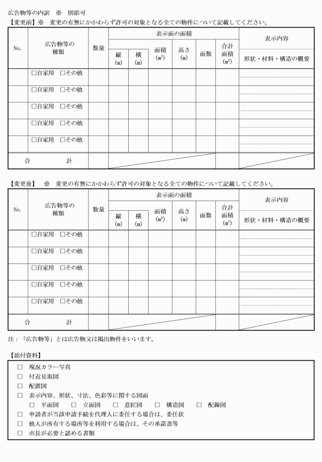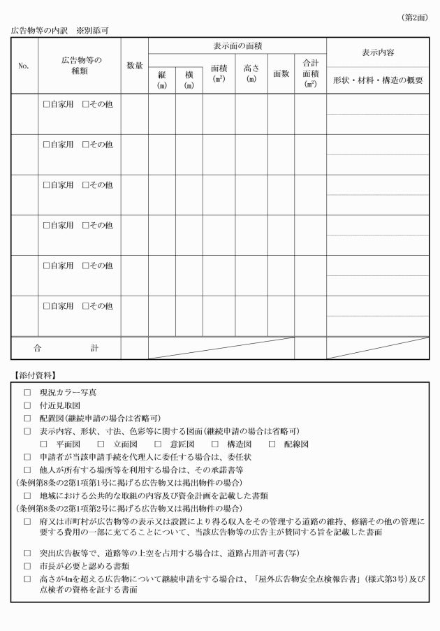 5 府条例第15条第1項の許可の申請は、次に掲げる書類を添えて、屋外広告物変更許可申請書(様式第2号)を市長に提出することにより行わなければならない。