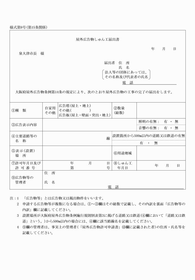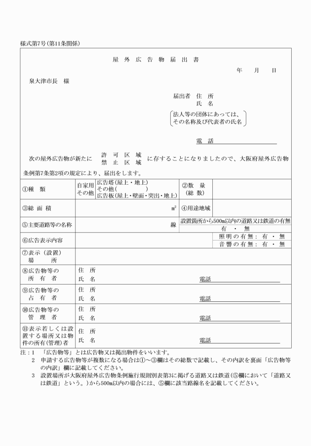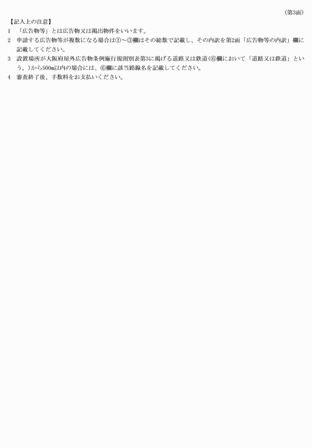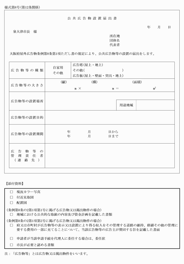 (3) 府条例第8条の2第1項第1号に掲げる広告物又は掲出物件にあっては地域における公共的な取組の内容及び資金計画を記載した書類又はこれに準ずるもの、同項第2号に掲げる広告物又は掲出物件にあっては大阪府又は泉大津市が広告物等の表示又は設置により得る収入をその管理する道路の維持、修繕その他の管理に要する費用の一部に充てることについて当該広告物等の広告主が賛同する旨を記載した書面