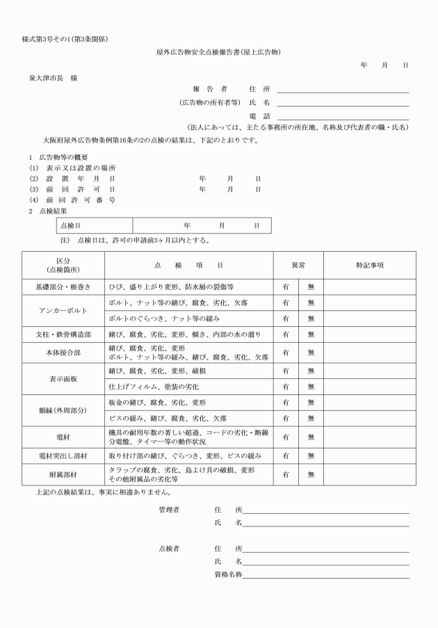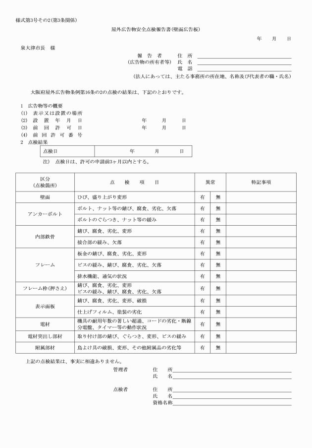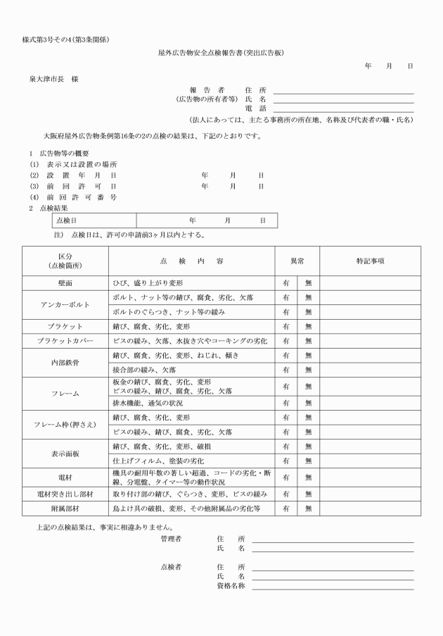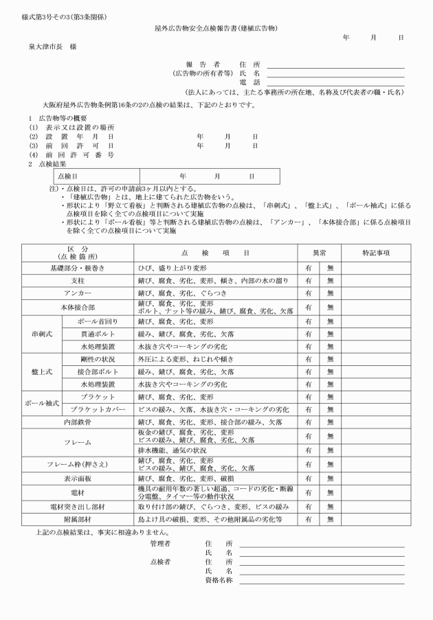 6 府条例第15条第2項に規定する書面は、屋外広告物安全点検報告書(様式第3号)とする。