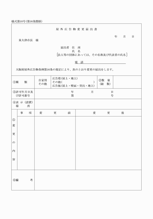 第16条 府条例第16条の規定による届出は、屋外広告物変更届出書(様式第10号)を市長に提出することにより行わなければならない。