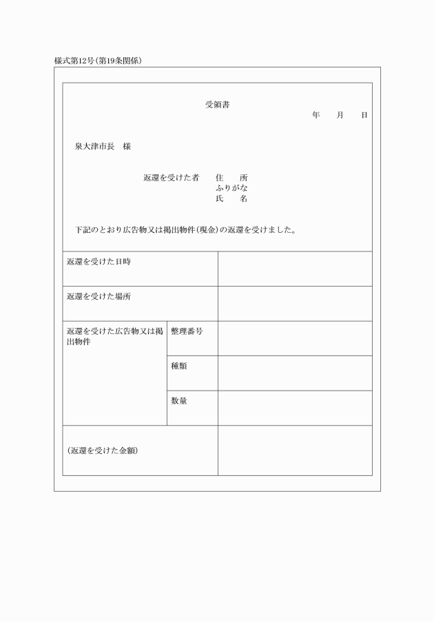 第19条 市長は、法第8条第1項の規定により保管した広告物又は掲出物件(同条第3項の規定により売却した代金を含む。)を当該広告物又は掲出物件の所有者等(同条第2項に規定する所有者等をいう。以下同じ。)に返還するときは、返還を受ける者にその氏名及び住所を証するに足りる書類を提示させる等の方法によってその者が当該広告物又は掲出物件の返還を受けるべき所有者等であることを証明させ、かつ、受領書(様式第12号)と引換えに返還するものとする。