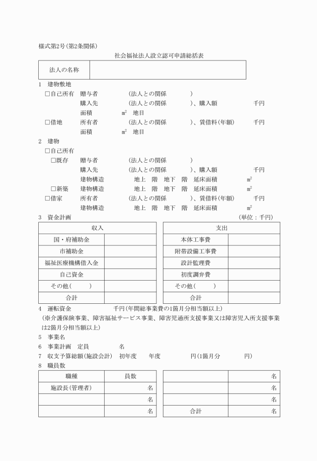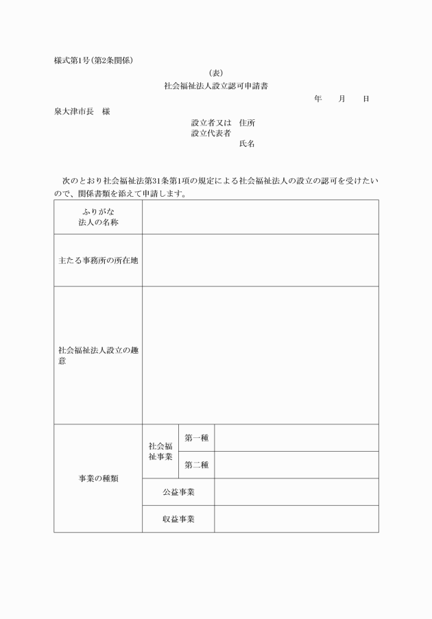 第2条 省令第2条第1項に規定する申請書は、社会福祉法人設立認可申請書(様式第1号)とする。