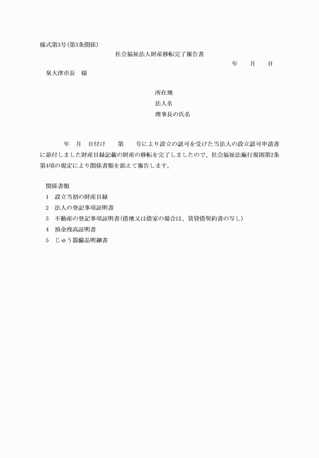 第3条 省令第2条第4項の規定による報告は、社会福祉法人財産移転完了報告書(様式第3号)により行わなければならない。