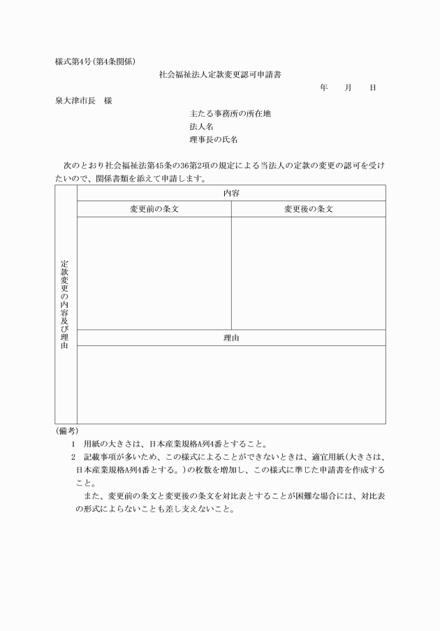 第4条 省令第3条第1項に規定する申請書は、社会福祉法人定款変更認可申請書(様式第4号)とする。