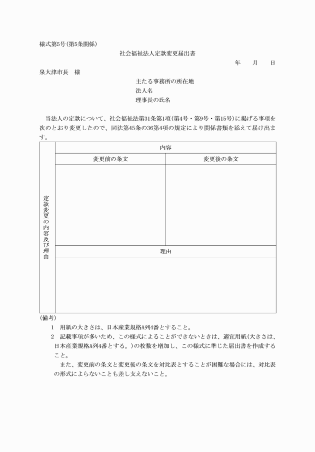 第5条 省令第4条第2項において読み替えて準用する省令第3条第1項に規定する届出書は、社会福祉法人定款変更届出書(様式第5号)とする。