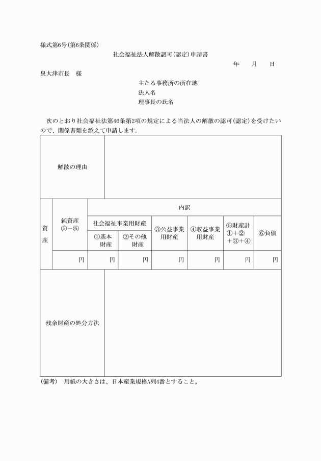 第6条 省令第5条第1項に規定する申請書は、社会福祉法人解散認可(認定)申請書(様式第6号)とする。