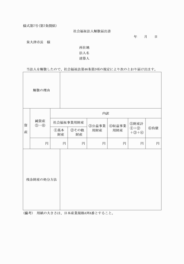 第7条 法第46条第3項の規定による届出は、社会福祉法人解散届出書(様式第7号)により行わなければならない。