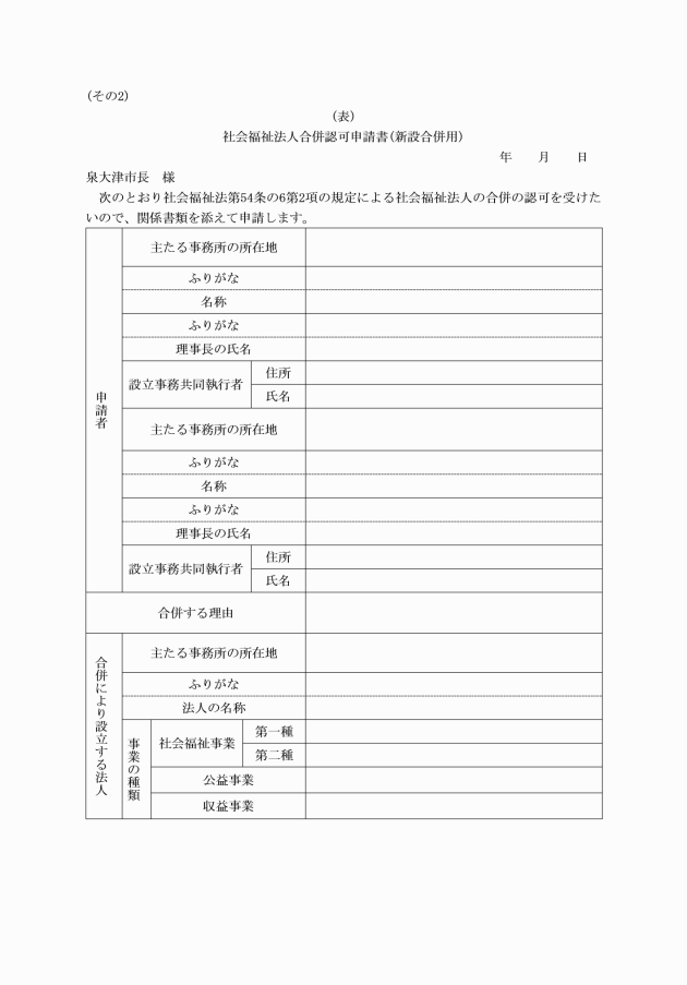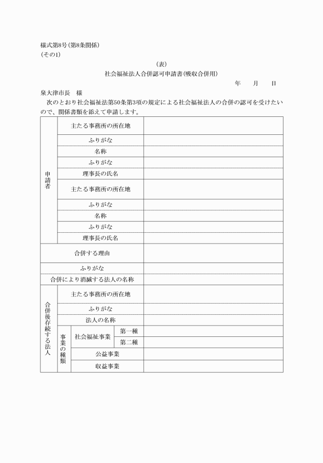 第8条 省令第6条第1項に規定する申請書は、社会福祉法人合併認可申請書(様式第8号)とする。