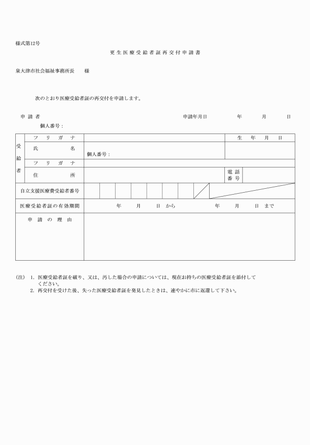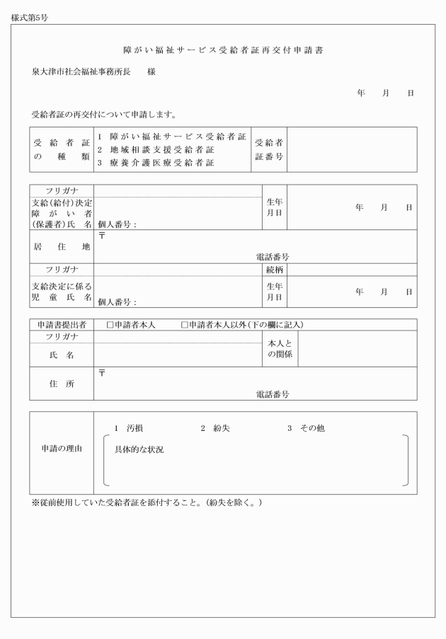 第6条 省令第23条第1項の規定による受給者証の再交付の申請書は、様式第5号とする。