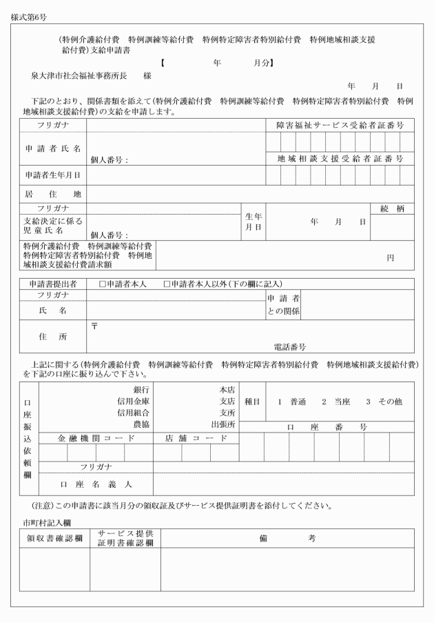 第7条 省令第31条第1項の規定による特例介護給付費及び特例訓練等給付費(以下これらを「特例介護給付費等」という。)の支給の申請書は、様式第6号とする。