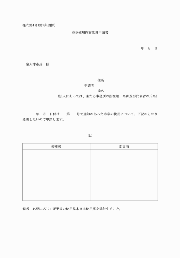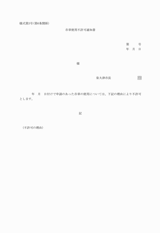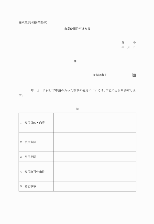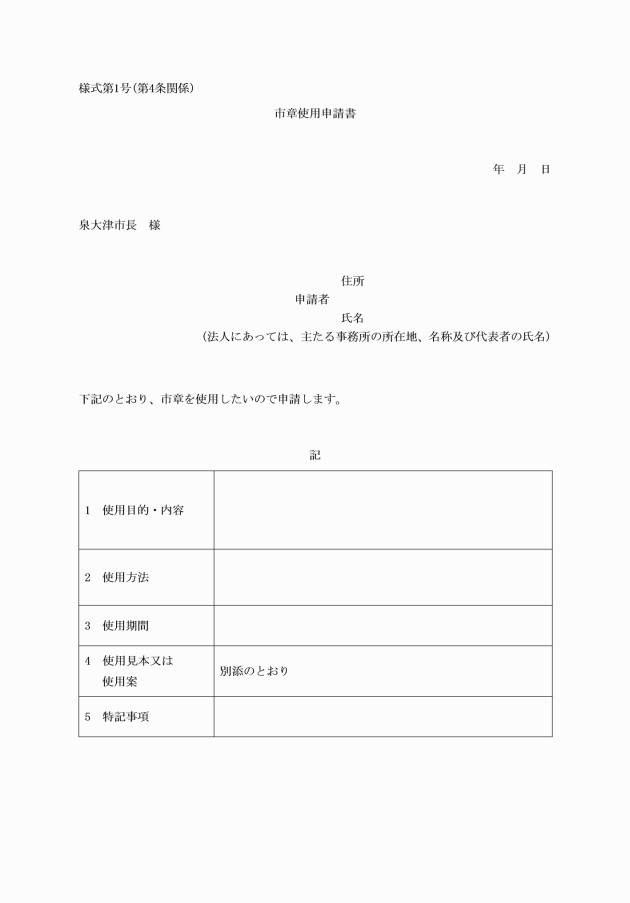 第4条 市章を使用しようとする者(以下「申請者」という。)は、市章使用申請書(様式第1号)をあらかじめ市長に提出し、その許可を受けなければならない。ただし、市の機関が市の事務又は事業において使用する場合は、この限りでない。