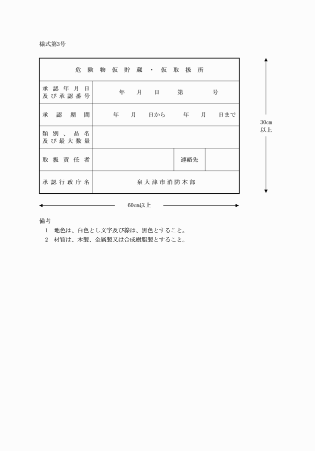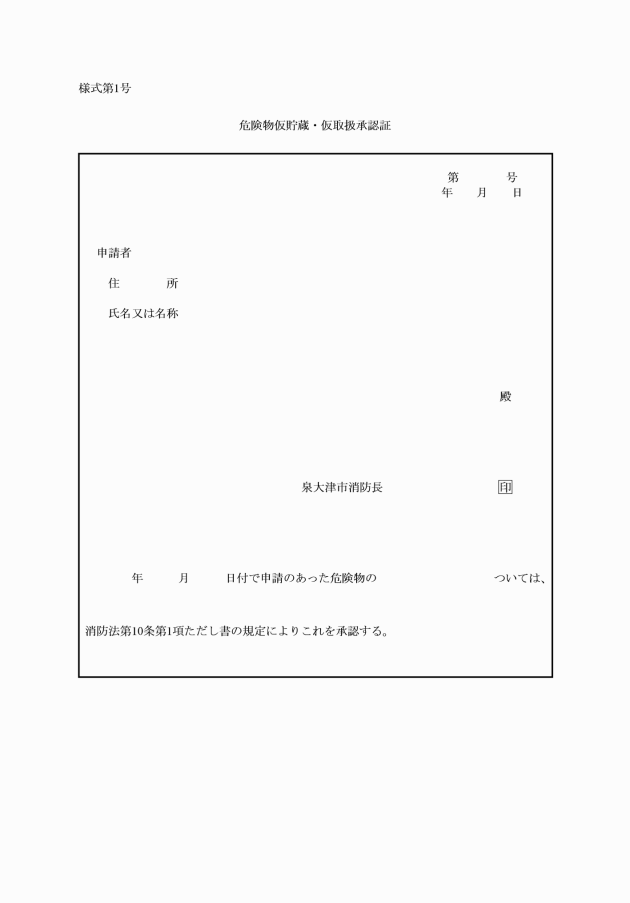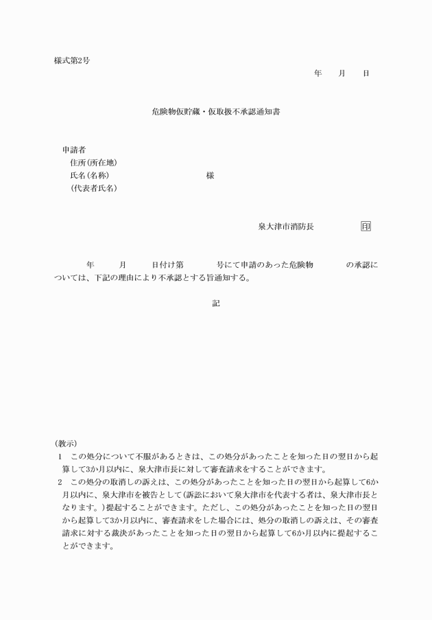 第2条 法第10条第1項ただし書の規定により危険物を仮に貯蔵し、又は取り扱おうとする者は、その貯蔵し、又は取り扱おうとする日の5日前までに府令に定める様式により消防長に2部提出し、その承認を受けなければならない。