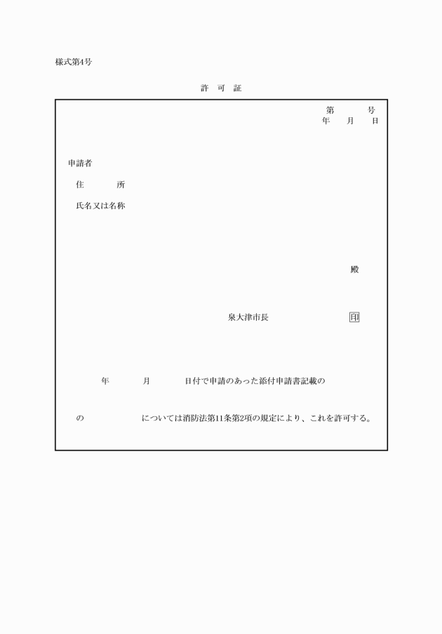 第3条 市長は、法第11条第1項前段の規定による製造所、貯蔵所又は取扱所(以下「製造所等」という。)の設置の許可及び同項後段の規定による変更の許可の申請があった場合において、同条第2項の規定により許可をする場合は、許可証(様式第4号)を申請者に交付するものとする。