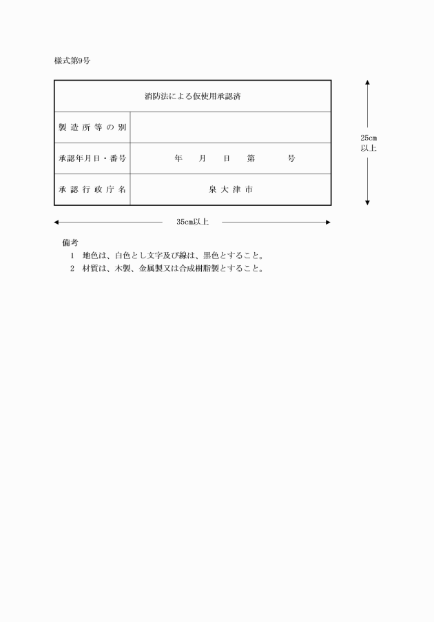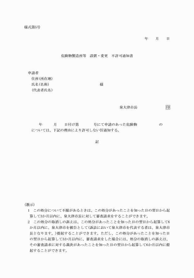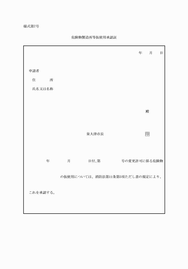 第5条 市長は、法第11条第5項ただし書の規定により、製造所等の仮使用の承認の申請があった場合において当該申請を受けた事項について承認をする場合は、危険物製造所等仮使用承認証(様式第7号)を申請者に交付するものとする。