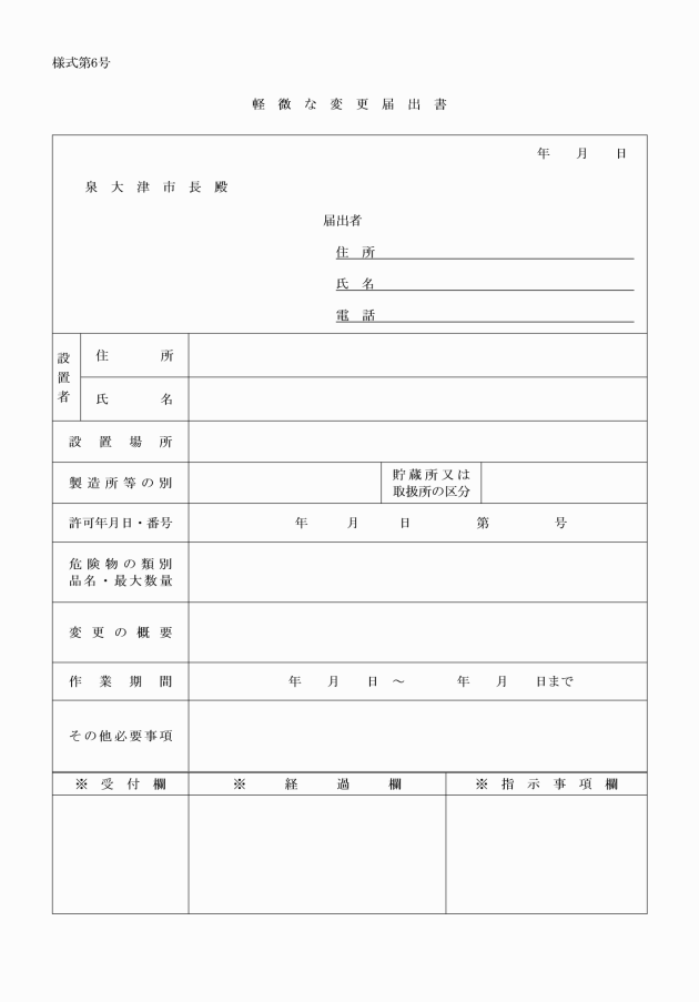 第4条 法第11条第1項後段の変更許可を必要としない軽微な変更(以下「軽微な変更」という。)をしようとする者は、当該軽微な変更を行おうとする10日前までに、軽微な変更届出書(様式第6号)2部を市長に提出しなければならない。