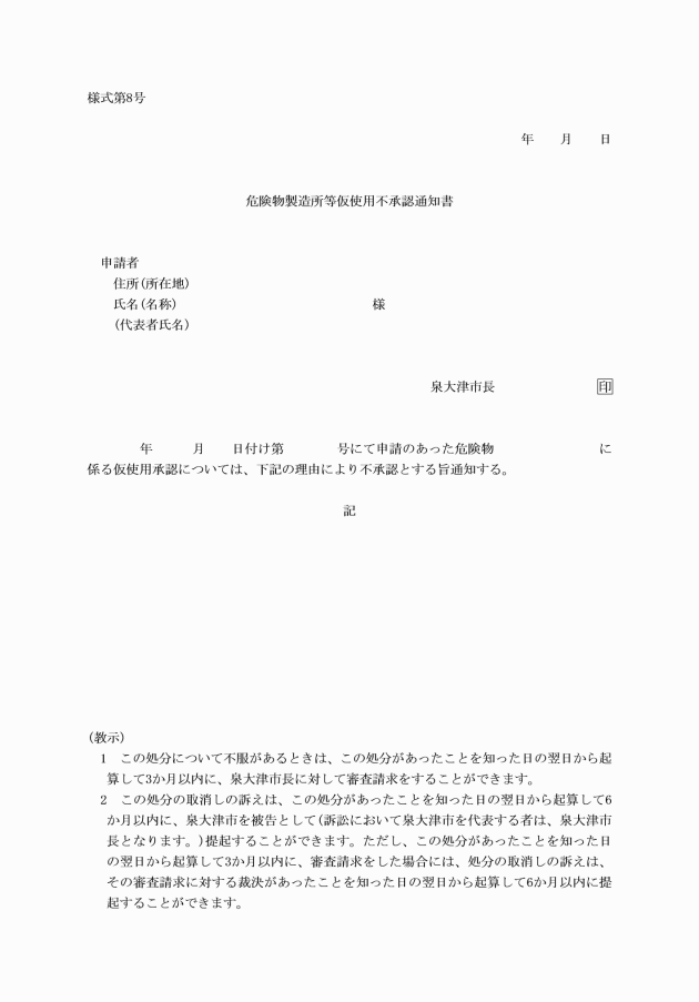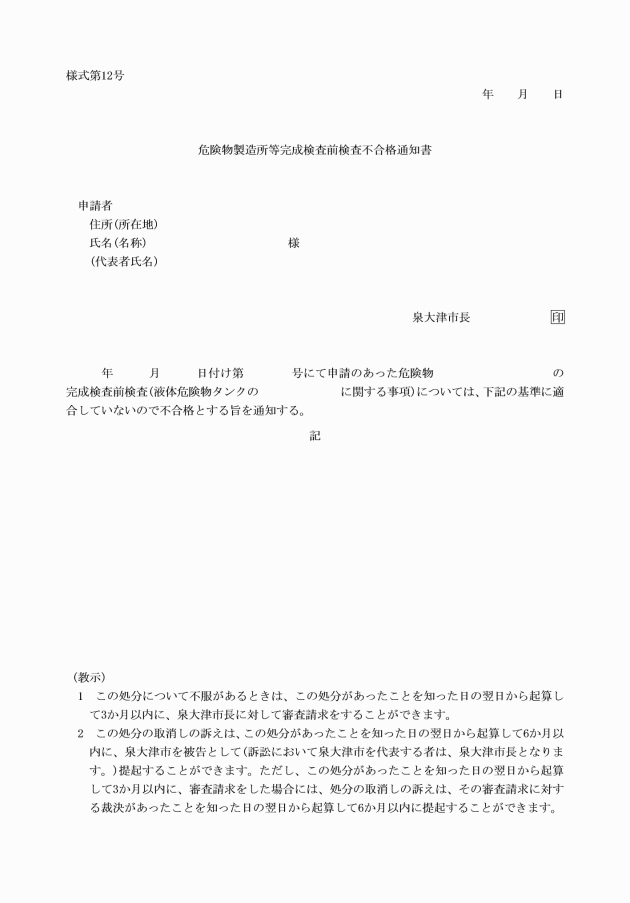 第8条 市長は、法第11条の2第1項の規定による検査を行った結果、法第10条第4項の技術上の基準に適合していないと認める場合は、危険物製造所等完成検査前検査不合格通知書(様式第12号)を申請者に交付するものとする。