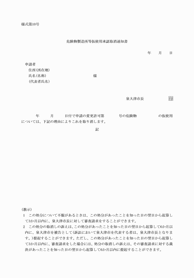 第10条 法第12条の6の規定により製造所等の用途を廃止した者は、当該届出書に完成検査済証を添付して、遅滞なく市長に提出しなければならない。