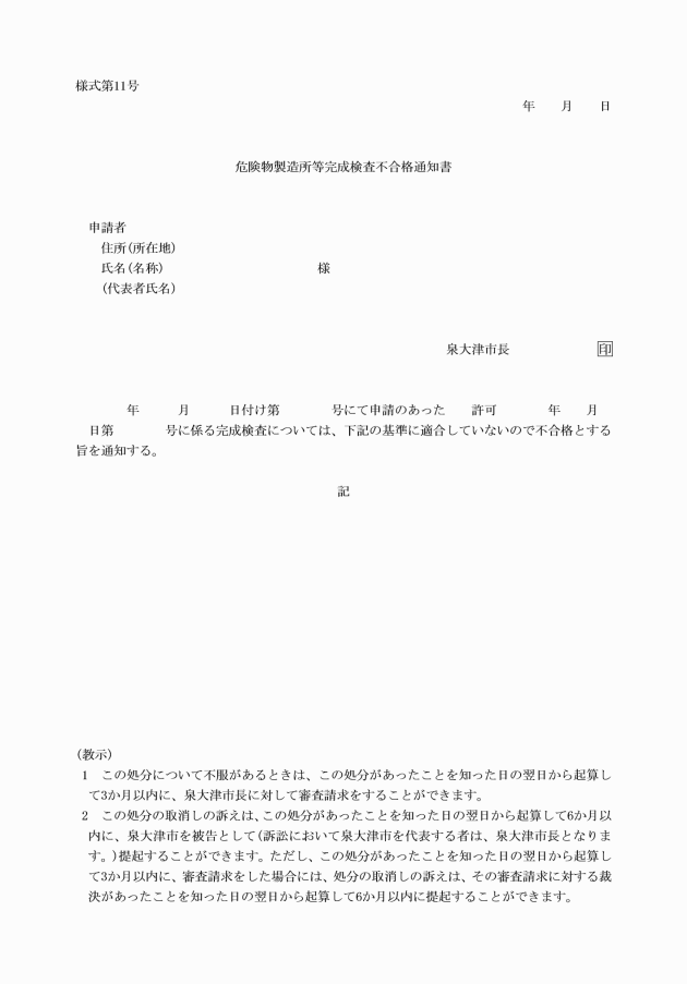 第7条 市長は、法第11条第5項の規定による完成検査を行った結果、法第10条第4項の技術上の基準に適合していないと認める場合又は法第11条第1項の設置若しくは変更の許可の内容と異なると認める場合は、危険物製造所等完成検査不合格通知書(様式第11号)を申請者に交付するものとする。